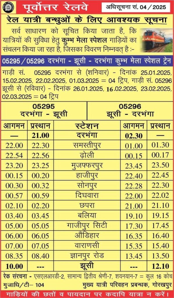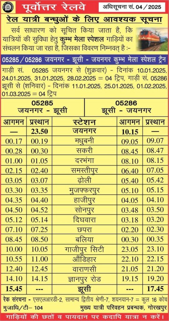 मुख्य यात्री परिवहन प्रबंधक, गोरखपुर रेलवे द्वारा जारी अधिसूचना संख्या 04/2025 के मुताबिक रेल यात्रियों के लिए आवश्यक सूचना में सर्व साधारण यात्रियों को सूचित किया गया कि यात्रियों की सुविधा हेतु कुम्भ मेला स्पेशल गाड़ियों का संचालन किया जा रहा है। जिसमें से 05285/05286 जयनगर – झूसी – जयनगर कुम्भ मेला स्पेशल ट्रेन का विवरण निम्नवत् है। गाड़ी सं० 05285/05286 जयनगर- झूसी- जयनगर कुंभ मेला स्पेशल (दरभंगा- समस्तीपुर- मुजफ्फरपुर- हाजीपुर- गाजीपुर सिटी- वाराणसी के रास्ते) – गाड़ी सं० 05285 जयनगर- झूसी कुंभ मेला स्पेशल 10, 24 एवं 31 जनवरी तथा 28 फरवरी, 2025 को जयनगर से 23.50 बजे खुलकर अगले दिन 01.00 दरभंगा, 03.30 बजे मुजफ्फरपुर, 04.35 बजे हाजीपुर सहित अन्य स्टेशनों पर रूकते हुए 12.40 बजे वाराणसी तथा 15.45 बजे झूसी पहुंचेगी। वापसी में, गाड़ी सं० 05286 झूसी-जयनगर कुंभ मेला स्पेशल 11 एवं 25 जनवरी, 01 फरवरी तथा 01 मार्च, 2025 को झूसी से 17.45 बजे खुलकर 21.05 बजे वाराणसी, अगले दिन 04.05 बजे हाजीपुर, 05.10 बजे मुजफ्फरपुर, 08.10 बजे दरभंगा सहित अन्य स्टेशनों पर रूकते हुए 10.15 बजे जयनगर पहुंचेगी।