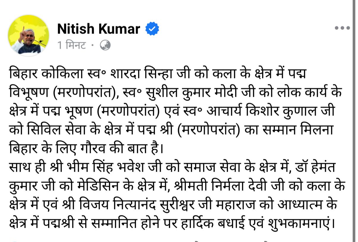 मुख्यमंत्री श्री नीतीश कुमार ने बिहार कोकिला स्वo शारदा सिन्हा को कला के क्षेत्र में पद्म विभूषण, स्वo सुशील कुमार मोदी को लोक कार्य के क्षेत्र में पद्म भूषण एवं स्वo आचार्य किशोर कुणाल को सिविल सेवा के क्षेत्र में पद्म श्री से सम्मानित करने की घोषणा पर प्रसन्नता व्यक्त की है। साथ ही मुख्यमंत्री ने श्री भीम सिंह भवेश को समाज सेवा के क्षेत्र में, डॉ हेमंत कुमार को मेडिसिन के क्षेत्र में, श्रीमती निर्मला देवी को कला के क्षेत्र में एवं श्री विजय नित्यानंद सुरीश्वर जी महाराज को अध्यात्मवाद के क्षेत्र में पद्मश्री से सम्मानित होने की घोषणा पर मुख्यमंत्री ने बधाई एवं शुभकामनाएं दीं हैं।