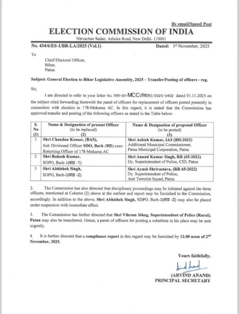 ब्रेकिंग:- दुलारचंद हत्याकांड के बाद चुनाव आयोग का बड़ा एक्शन पटना के ग्रामीण एसपी बिक्रम सिहाग, बाढ़ एसडीएम चंदन कुमार, बाढ़ ASP राकेश कुमार का तत्काल प्रभाव से तबादला, वहीं एसडीपीओ 2 अभिषेक सिंह, भदौर थानाध्यक्ष रवि रंजन कुमार और घोसवरी थाना अध्यक्ष मधुसूदन कुमार को किया गया निलंबित। पटना म्युनिसिपल कॉर्पोरेशन में तैनात IAS आशीष कुमार को बाढ़ के नये एसडीएम का मिला पदभार, जबकी ASP राकेश कुमार की जगह सिआईडी में तैनात आनंद कुमार को एसडीपीओ 1 की कमान, वहीं निलंबित एसडीपीओ 2 अभिषेक सिंह की जगह एंटी टेररिस्ट स्क्वाड में तैनात आशीष कुमार श्रीवास्तव को एसडीपीओ 2 की दी गई कमान,ग्रामीण पुलिस अधीक्षक के लिये विभाग से अधिकारीयों के नाम चुनाव आयोग ने माँगे, वहीं चुनाव आयोग ने निलंबित व स्थानांतरित किए गए अधिकारियों के खिलाफ विभागीय कार्रवाई शुरू करने के भी सख्त आदेश जारी कर दिए हैं!