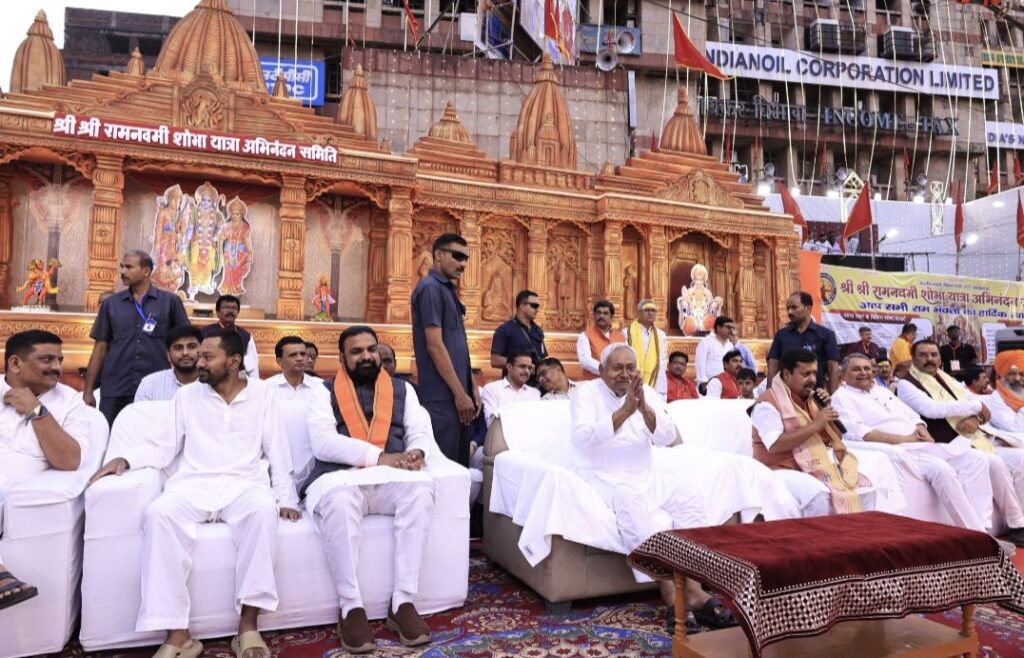पटना, 27 मार्च 2026 :- मुख्यमंत्री श्री नीतीश कुमार आज शाम श्री रामनवमी के अवसर पर पटना के डाकबंगला चौराहा पर श्री श्री रामनवमी शोभा यात्रा अभिनन्दन समिति द्वारा आयोजित कार्यक्रम में शामिल हुये। मुख्यमंत्री ने शोभा यात्रा का स्वागत कर आरती की तथा उन्हें प्रतीक चिह्न भेंटकर सम्मानित किया।
