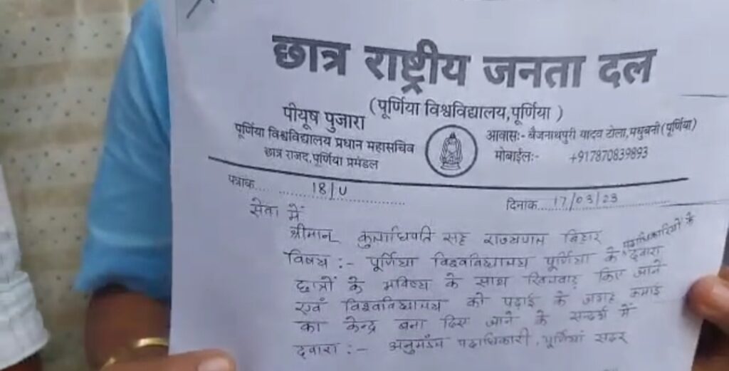पूर्णिया दौरे के दूसरे दिन पूर्णिया विश्वविद्यालय की सीनेट बैठक में शामिल होने पहुंचे राज्यपाल राजेंद्र विश्वनाथ आर्लेकर को ज्ञापन देने पहुंचे। हालांकि प्रोटोकॉल के तहत ज्ञापन दिए जाने से रोके जाने को लेकर छात्र राजद नाराज दिखा। छात्र राजद ने आरोप लगाते हुए कहा कि विश्वविद्यालय आने पर एबीवीपी के छात्र नेताओं को राज्यपाल से मुलाकात का समय मिल गया। मगर छात्र राजद हो या छात्र जाप अपनी मांगों से जुड़े ज्ञापन सौंपने की बात कही जाने पर सुरक्षा प्रोटोकॉल का हवाला देकर उन्हें टाल दिया गया।