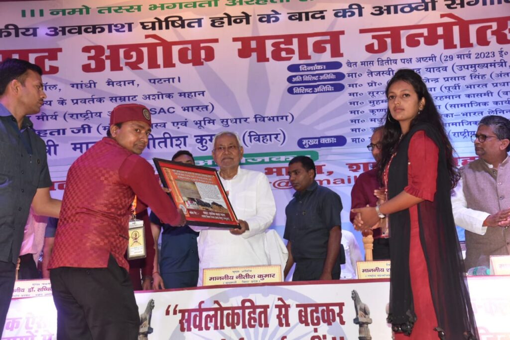 पटना, 29 मार्च 2023 :- मुख्यमंत्री श्री नीतीश कुमार सम्राट अशोक महान के जन्मोत्सव समारोह में शामिल हुए। श्रीकृष्ण मेमोरियल हॉल में सम्राट अशोक क्लब, भारत, शाखा बिहार द्वारा आयोजित जन्मोत्सव समारोह में मुख्यमंत्री ने भगवान बुद्ध एवं सम्राट अशोक महान के तैल चित्र पर पुष्पांजलि अर्पित कर उन्हें नमन किया। आयोजकों ने मुख्यमंत्री को गुलदस्ता, अंगवस्त्र और प्रतीक चिन्ह भेंटकर उनका अभिनंदन किया।