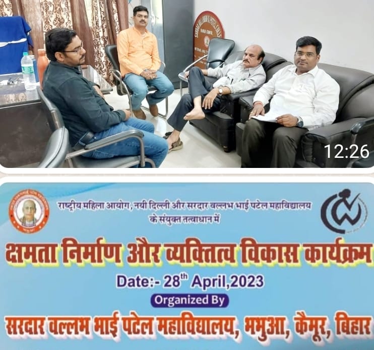 सरदार वल्लभभाई पटेल महाविद्यालय भभुआ कैमूर में अगामी 28 अप्रैल को राष्ट्रीय महिला आयोग और महाविद्यालय शोध विकास प्रकोष्ठ के संयुक्त तत्वावधान में छात्राओं के लिए क्षमता निर्माण और व्यक्तित्व विकास कार्यक्रम का आयोजन होगा। इस कार्यक्रम के संयोजक डॉ अजीत कुमार राय और डॉ आनंद प्रकाश है। साथ ही वाराणसी की धर्म लक्ष्य संस्थान भी सह आयोजक है । धर्म लक्ष्य संस्थान वाराणसी में महिलाओं के क्षमता एवं व्यक्तित्व विकास के लिए पिछले तीन वर्षो से कार्य कर रही है ।प्राचार्य डॉ शंकर प्रसाद शर्मा की अध्यक्षता में आयोजित इस कार्यक्रम में मुख्य अतिथि डीएवी पब्लिक स्कूल के निदेशक श्री दिनेश सिंह और विशिष्ट अतिथि नेहरू युवा केंद्र, कैमूर के पदाधिकारी श्री सुशील करौलिया होंगे। मुख्य वक्ता सरदार वल्लभभाई पटेल महाविद्यालय के इतिहास विभाग की विभागाध्यक्ष डॉ सीमा पटेल होंगीं। अन्य वक्ताओं में महाविद्यालय के मनोविज्ञान विभाग से डॉ अन्नापूर्णा गुप्ता, काशी हिन्दू विश्वविद्यालय, वाराणसी से डॉ सुतापा दास, बी आर बी कॉलेज,समस्तीपुर से डॉ प्रियंका मिश्रा, नेहरू ग्राम भारती मानित विश्विद्यालय, प्रयागराज से डॉ मीता रतावा तिवारी और श्री शंकर कॉलेज, सासाराम से डॉ दीपक कुमार होंगे।कार्यक्रम में महिला विकास से संबंधित ऐतिहासिक, सामाजिक, आर्थिक, मनोवैज्ञानिक, संवैधानिक और नैतिक पहलुओं पर चर्चा होगी। हमारी बेटियो को सशक्त करके ही समाज और देश का चतुर्दिक विकास संभव है। संयोजक डॉ अजीत कुमार राय ने बताया कि इस कार्यक्रम के माध्यम से कैमूर जैसे पिछड़े क्षेत्र में हमारी कोशिश होगी कि हम अपनी बेटियो को जीवन के हर क्षेत्र में सफल बनाएं। गत सितंबर माह में भारतीय सामाजिक विज्ञान अनुसंधान परिषद नई दिल्ली द्वारा सरदार वल्लभभाई पटेल महाविद्यालय में प्रायोजित राष्ट्रीय सेमिनार में प्रस्तुत चुनिंदा लेखों को “India’Rich Cultural Heritage: Preservation and Promotion” नामक आईएसबीएन वाली एक पुस्तक के रूप में छापा गया है जिसके संपादक डॉ अखिलेंद्र नाथ तिवारी, डॉ मीता रतावा तिवारी और डॉ अजीत कुमार राय हैं। इस पुस्तक का विमोचन कार्यक्रम के उद्घाटन सत्र में होगा।इस कार्यक्रम का उद्घाटन 28 अप्रैल शुक्रवार को सुबह आठ बजे होगा जिसमें 250 से 300 की संख्या में छात्राओं, शिक्षकों और कर्मचारियों की भागीदारी होगी।