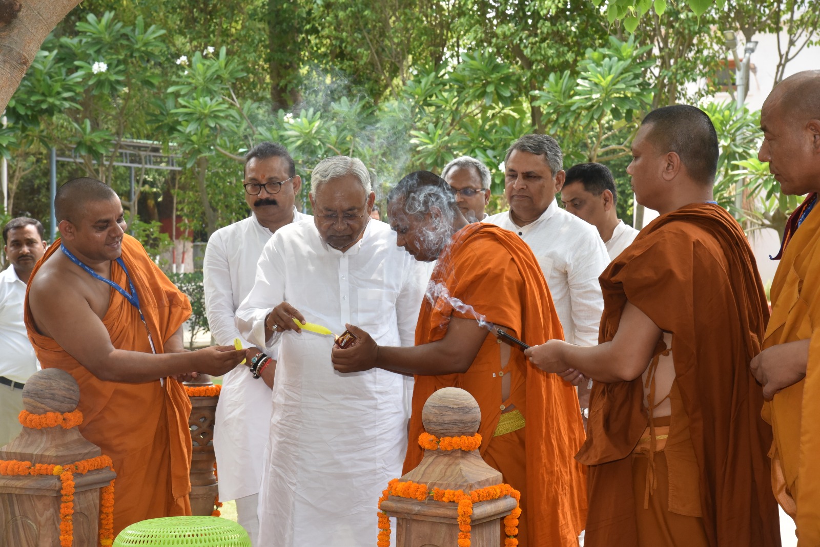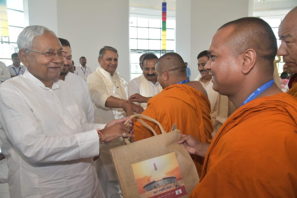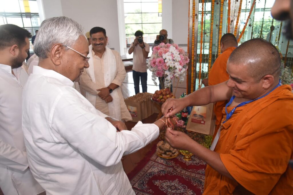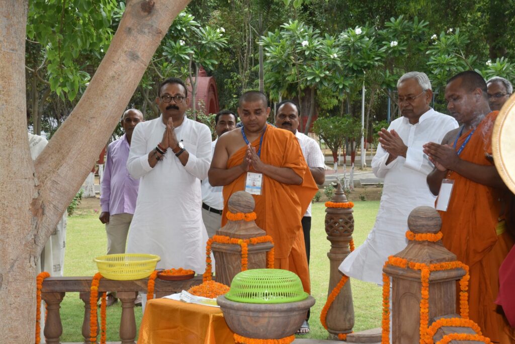 पटना, 05 मई 2023 :- मुख्यमंत्री श्री नीतीश कुमार ने आज भगवान बुद्ध की 2567वीं जयंती के अवसर पर बुद्ध स्मृति पार्क में आयोजित विशेष कार्यक्रम में भगवान बुद्ध की पूजा अर्चना की। मुख्यमंत्री ने बुद्ध स्मृति पार्क में भगवान बुद्ध, बोधिवृक्ष एवं आनंद बोधि वृक्ष की पूजा-अर्चना की। बौद्ध भंते श्री गौतम एवं श्री रेवता भंते ने मुख्यमंत्री को पूजा अर्चना कराई। मुख्यमंत्री ने बुद्ध स्मृति पार्क स्थित पाटलिपुत्र करुणा स्तूप में भगवान बुद्ध की पवित्र अस्थि के सामने भगवान बुद्ध की पूजा अर्चना की, परिक्रमा की और ध्यान किया। उन्होंने बौद्ध भिक्षुओं के साथ बैठकर विश्व शांति के लिए मंगल कामना की तथा राज्य एवं देश की सुख, समृद्धि एवं अमन चैन की कामना की। मुख्यमंत्री को बौद्ध भंते द्वारा बुद्ध स्मृति पार्क में प्रतिस्थापित बुद्ध की प्रतिमा तथा बोधगया का बोधिवृक्ष तथा श्रीलंका के अनुराधापूरम से लाये गए वृक्ष की पूजा अर्चना करायी गई।