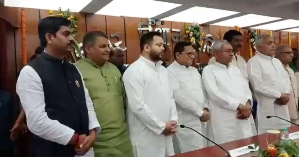 पटना: बिहार विधान परिषद के लिए नवनिर्वाचित चारों सदस्यों ने आज विधान परिषद की सदस्यता की शपथ ली. सभापति देवेश चंद्र ठाकुर ने सभी को गोपनीयता की शपथ दिलाई. इस मौके पर मुख्यमंत्री नीतीश कुमार, उपमुख्यमंत्री तेजस्वी यादव और संसदीय कार्य मंत्री विजय कुमार चौधरी भी मौजूद रहे. विधान परिषद की सदस्यता की शपथ लेने वालों में दो बीजेपी और दो जेडीयू के सदस्य शामिल हैं.