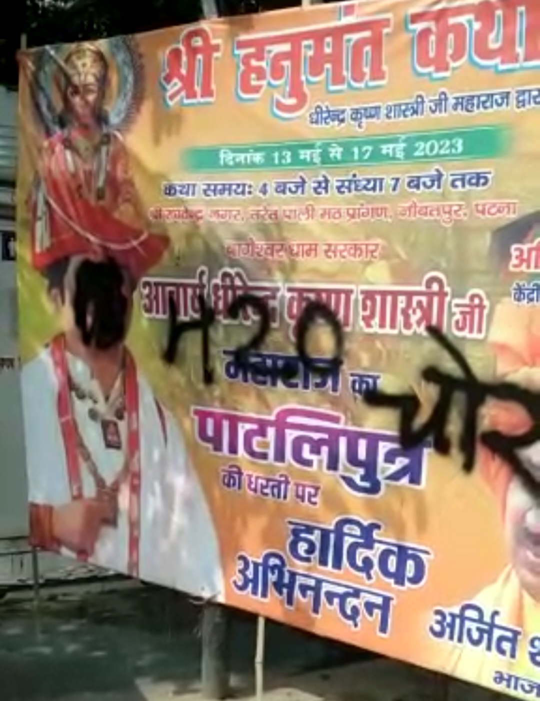 पटना के इनकम टैक्स गोलंबर पर आचार्य धीरेंद्र कृष्ण शास्त्री के पोस्टर पर कालिख पोती गई। उस पर 420 लिखा गया है और चोर लिखा गया है। ऐसा पोस्टर कई जगहों पर लगाया गया है। पटना के इनकम टैक्स के अलावा हाई कोर्ट के मोड़ पर भी इसी तरह से पोस्टर के साथ किया गया है। यह पोस्टर अश्वनी चौबे के पुत्र अर्जित सारस्वत ने कई जगहों पर लगाया है जिस पर कालिख पोती गई है।