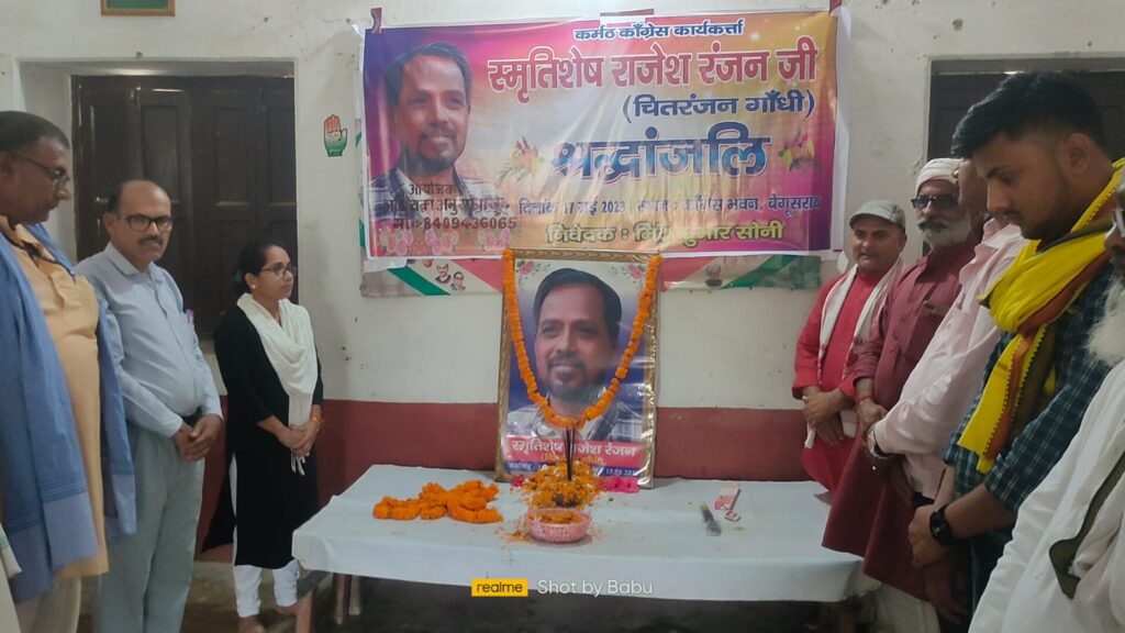 बेगूसराय कांग्रेस भवन में नगर कांग्रेस पार्टी के समर्पित कार्यकर्ता चितरंजन गांधी की प्रथम पुण्यतिथि मनाई गई l कार्यक्रम की अध्यक्षता सामाजिक कार्यकर्ता समर्पित कांग्रेसी मिंटू कुमार सोनी ने किया इस कार्यक्रम में नगर कांग्रेस कमेटी के अध्यक्ष पूर्व पार्षद. ब्रजेश कुमार प्रिंस ने चितरंजन गांधी को श्रद्धांजलि अर्पित करते हुए कहा कि समाज में बड़े लोगों एवं बड़े नेताओं का पुण्यतिथि और जयंती मनाई जाती है लेकिन आज कार्यकर्ता का पुण्यतिथि मनाने का यह पहला कार्य कांग्रेस भवन में किया गया है इससे कार्यकर्ताओं का मनोबल बढ़ता है और वास्तव में इस सम्मान के हकदार कार्यकर्ता ही होते हैं l इस प्रथम पुण्यतिथि कार्यक्रम में दिवंगत चितरंजन गांधी जी की पुत्री अनुराधा कुमारी अधिवक्ता.नगर निगम के पार्षद राजकुमार. देव कुमार देव. जिला कांग्रेस के पूर्व सचिव रणजीत कुमार मुखिया जी. नगर कांग्रेस के अभिषेक कुमार. सेवादल के अशोक कुमार सिंह. राम पदारथ यादव अधिवक्ता. मोहम्मद कुड्डूस. बाल्मीकि महतो अधिवक्ता. डॉ जितेंद्र राय.गोपाल कुमार अधिवक्ता. नवल राय. पवन गांधी अधिवक्ता. कमल कुमार सरपंच. गोलू कुमार. सोनू कौशिक. सहित अन्य कांग्रेस जन उपस्थित थे पुण्यतिथि के उपरांत लोगों ने एक-एक कर उनके चित्र पर पुष्पांजलि अर्पित किया l
