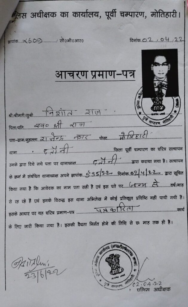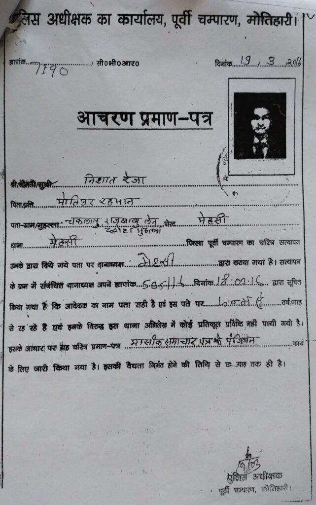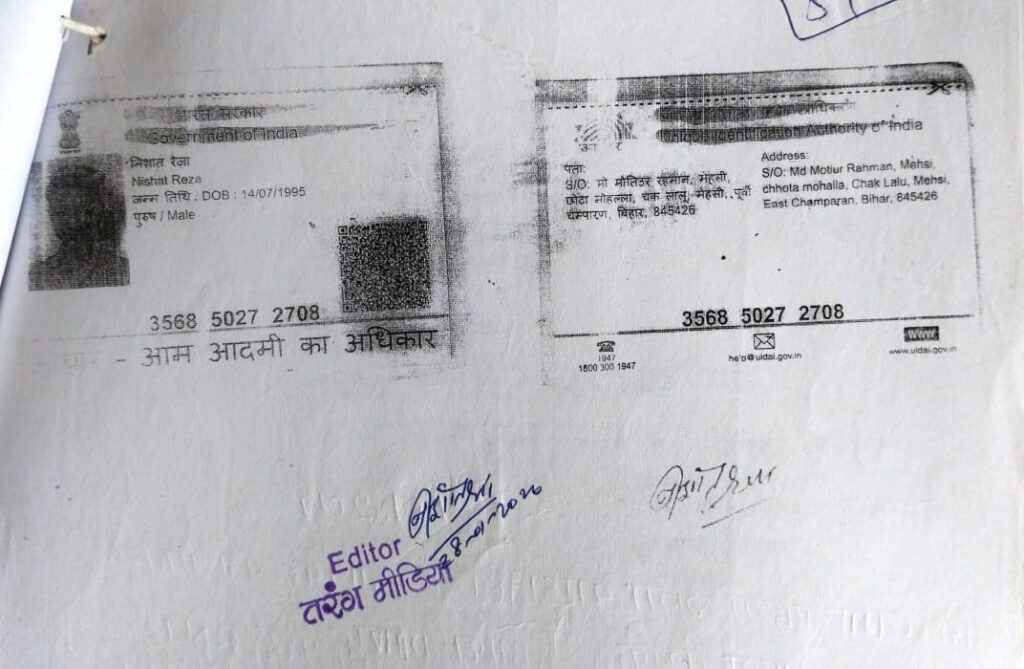 एक आधार कार्ड निशांत राज पिता राजबाबू ,पता राजेंद्र नगर मोतिहारी के नाम पर ले रखा है दूसरा आधार कार्ड निशांत रेजा, पिता -मोहम्मद मौतुर रहमान,पता – चक लालू ,मेहसी थाना के नाम पर ले रखा है।इतना ही नही इसने एसपी से भी दो अलग अलग पता और नाम पर कैरेक्टर सर्टिफिकेट भी बनवा रखा है। ताजा आरोप इस कथित संपादक पर एक आर्मी मैन की माँ ने लगाया है। महिला का आरोप है कि निशांत रेजा हिन्दू ब्राह्मण बनकर मेरे घर मे किराया पर आया और अश्लील वीडियो बनाकर यौन शोषण करने लगा। महिला की शिकायत पर जब पुलिस ने निशांत रेजा को गिरफ्तार किया तो उसके मोबाईल से कई महिलाओं की आपत्तिजनक वीडियो भी बरामद हुई है।
