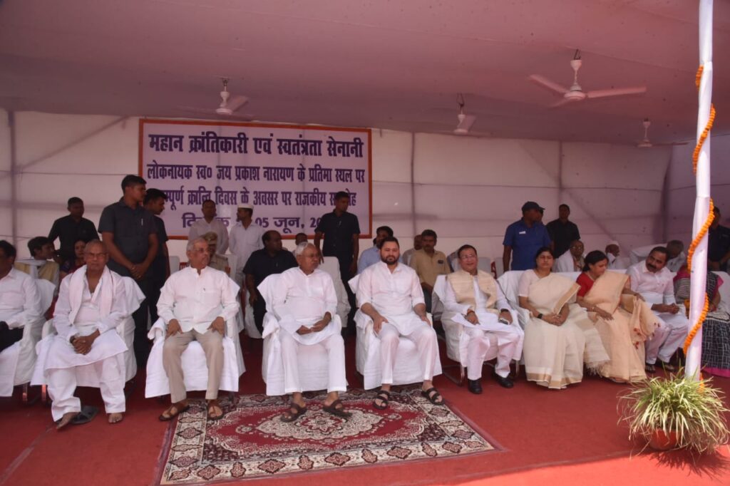 इस अवसर पर उप मुख्यमंत्री श्री तेजस्वी प्रसाद यादव, खाद्य एवं उपभोक्ता संरक्षण मंत्री श्रीमती लेशी सिंह, परिवहन मंत्री श्रीमती शीला कुमारी, उद्योग मंत्री श्री समीर कुमार महासेठ, सूचना प्रावैधिकी मंत्री श्री इसराईल मंसूरी, विधान पार्षद श्रीमती कुमुद वर्मा, पूर्व मंत्री श्री श्याम रजक, पूर्व मंत्री श्री विक्रम कुंवर, मुख्यमंत्री के प्रधान सचिव डॉ० एस० सिद्धार्थ, जे०पी० सेनानीगण सहित अनेक सामाजिक एवं राजनीतिक कार्यकर्ताओं ने लोकनायक स्व० जयप्रकाश नारायण जी की प्रतिमा पर माल्यार्पण कर उन्हें श्रद्धाजलि अर्पित की। मुख्यमंत्री ने वहां उपस्थित जे०पी० सेनानियों से मुलाकात की और उनका कुशलक्षेम