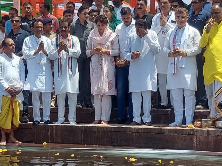 भोपाल : प्रियंका गांधी वाड्रा मध्य प्रदेश के जबलपुर में है जहां उन्होंने कांग्रेस के लिए चुनावी शंखनाद किया। जबलपुर पहुंचने पर प्रियंका वाड्रा सबसे पहले नर्मदा घाट पहुंचीं और आरती में हिस्सा लिया, लेकिन इस दौरान उन्होंने एक बड़ी गलती कर दी, जिस पर भाजपा ने जमकर निशाना साधा है। नर्मदा आरती के दौरान प्रियंका के एक तरफ कमल नाथ और दूसरी तरफ विवेक तन्खा खड़े थे। सभी नेता आरती कर रहे थे। प्रियंका ने नर्मदा जी की आरती उतारने के बाद आरती विवेक तन्खा को दी। इस दौरान आरती पूरी नहीं हुई थी, लेकिन प्रियंका ने खुद आरती ले ली।