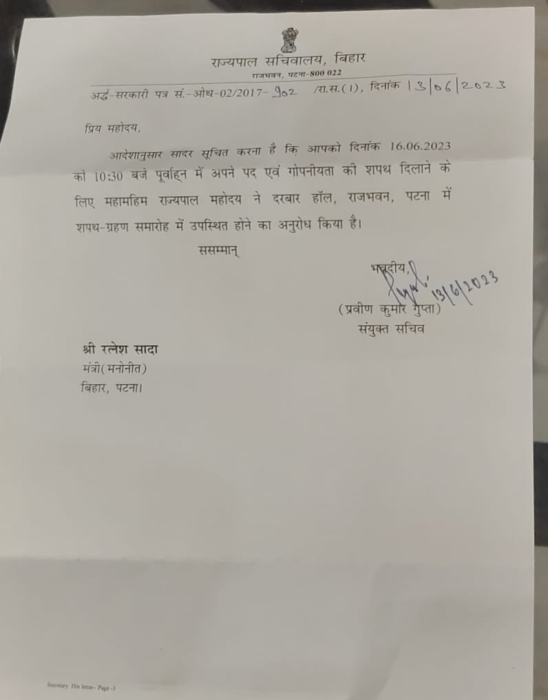 राज्यपाल ने रत्नेश सदा को भेजा पत्र, संतोष सुमन के इस्तीफे के बाद मुख्यमंत्री नितीश कुमार इसलिए मेहरबान हुए क्यूंकि रत्नेश सदा भी मांझी समाज से ही आते हैँ, और डैमेज कंट्रोल के मद्देनजर नितीश कुमार ने विधायक रत्नेश सदा को मंत्री मनोनीत किया है, उनका शपथ ग्रहण 16 जून को होगा!