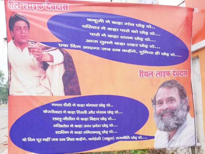 पटना : पटना में विपक्षी एकता की बैठक को लेकर भाजपा लगातार पोस्टरों से विपक्ष के नेताओं पर निशाना साध रही है। अब राहुल गांधी की तुलना देवदास से कर दी है। भाजपा कार्यालय के बाहर राहुल गांधी की पोस्टर लगाई गई है, जिसमें भाजपा नेताओं ने कांग्रेस नेता राहुल की तुलना 'देवदास' फिल्म से करते हुए उन्हें रीयल लाइफ देवदास बताया है। वहीं, जवाब में राजद ने भी पोस्टर लगाया, जिसमें भगवान विष्णु का विराट रूप है और उस रूप को महा गठबंधन बताया है। साथ में सभी विपक्षी दिग्गजों की फोटो लगी है। पोस्टर में फिल्म 'देवदास' का चर्चित डायलॉग को कॉपी किया गया है। पोस्टर में लिखा है कि 'ममता दीदी ने कहा बंगाल छोड़ दो.., केजरीवाल ने कहा दिल्ली और पंजाब छोड़ दो, लालू-नीतीश ने कहा बिहार छोड़ दो, अखिलेश ने कहा उत्तर प्रदेश छोड़ दो...स्टालिन ने कहा तमिलनाडु छोड़ दो...। वो दिन दूर नहीं जब सब मिल कहेंगे, राहुल राजनीति छोड़ दो..।