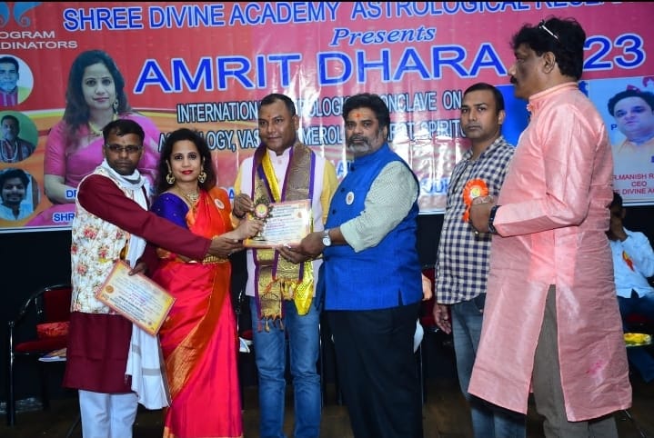 पूर्वी चम्पारण , मोतिहारी के केसरिया प्रखंड अंतर्गत नयागाँव निवासी,प्रख्यात अंतरराष्ट्रीय ज्योतिष एवं अध्यात्म गुरु आचार्य डॉ बाल्मीकि प्रसाद को मुख्य अतिथि के रूप में आमंत्रित कर,महाऋषि भृगु सम्मान और ज्योतिष श्री सम्मान प्रदान कर सम्मानित किया गया। बता दे की आज श्री जगन्नाथपुरी ओडिशा की पावन धरती पर एक दिवसीय भव्य अंतरराष्ट्रीय ज्योतिष महासम्मेलन का आयोजन किया गया था। यह आयोजन श्री डिवाइन एकेडमी एस्ट्रोलॉजिकल रिचर्च सेंटर के तत्वधान में,अमृत धारा 2023 के रूप में आयोजित किया गया। जिसमे देश विदेश के प्रख्यात ज्योतिषी एवं प्रकांड विद्वतजन शामिल हुए। वही अंतराष्ट्रीय स्तर पर पहचान बना चुके भारत के जाने-माने प्रख्यात वैदिक ज्योतिष, वास्तुशास्त्र,एवं,औरा स्कैनर विशेषज्ञ ज्योतिषाचार्य सह अध्यात्म गुरु डॉ बाल्मीकि प्रसाद ने पुरुस्कार मिलने के बाद सभी आयोजक मंडली का आभार करते हुए सफल महासम्मेलन के लिए बधाई दी ,मुख्य आयोजनकर्ता एवं श्री डिवाइन एकेडमी एस्ट्रोलॉजिकल रिसर्च सेंटर के मुख्य चेयरपर्सन एवं आयोजक डॉ दीपिका जेना (बेंगलुरु) के द्वारा अमृत धारा 2023 का अंतरराष्ट्रीय ज्योतिषीय महासम्मेलन आयोजित किया गया,जिसमे देश विदेश के करीब तीन सौ विद्वान ज्योतिषी शामिल हुए। इस सफल आयोजन के मुख्य अतिथि एवं वैदिक ज्योतिषाचार्य एवं तंत्र सम्राट पंडित कृपाराम जी,वैदिक ज्योतिष के प्रकांड विद्वान एवं कथाकार पंडित आचार्य डॉ संतोष भार्गव जी,वैदिक ज्योतिष संजीव कुमार झा जी,जगदीश सैनी जी,श्री डिवाइन एकेडमी एस्ट्रोलॉजिकल रिसर्च सेंटर के मुख्य कार्यकारी अध्यक्ष एवं चेयरपर्सन डॉ दीपिका जैना,फाउंडर एंड सीईओ डॉ मनीष रावत,निदेशक डॉ सुशांत होता के द्वारा आयोजित महासम्मेलन काफी सफल एवं सराहनीय रहा,आचार्य डॉ बाल्मीकि प्रसाद ने संस्थान के सभी वरिष्ठ अधिकारीगण, सम्मानित कार्यकर्तागण एवं देश विदेश से आए सभी वरिष्ठ ज्योतिष विद्वतजन एवं भारत वर्ष के सभी सम्मानित नागरिकों का सहृदय नमन, वंदन करते हुए संस्थान के सभी अधिकारीगणों का आभार प्रकट किया है।