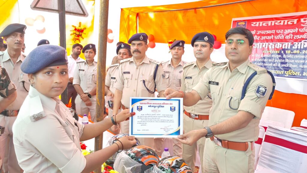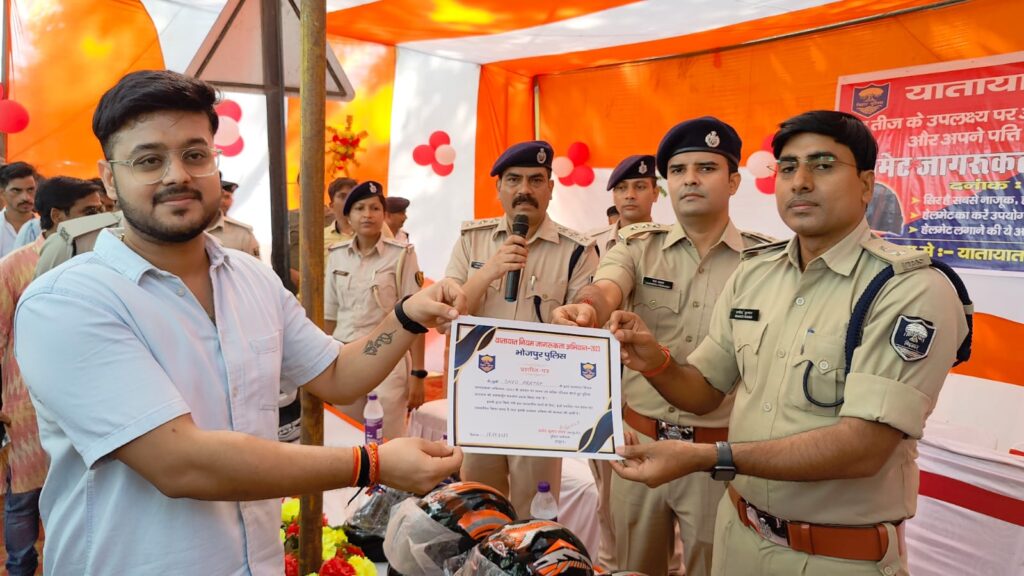 आज दिनांक 18 सितंबर 2023 को भोजपुर पुलिस अधीक्षक के नेतृत्व में सड़क सुरक्षा तथा यातायात नियमों के पालन हेतु एक अभियान चलाया गया जिसमें बिना हेलमेट चलने वाले लोगों को न सिर्फ हेलमेट मुफ्त में वितरित किया गया ,साथ में यातायात नियमों तथा हेलमेट पहनने से होने वाली जीवन रक्षा के बारे में जागरूक किया गया। इसके अतिरिक्त इस कार्य में सहयोग करने वाले यातायात पुलिस कर्मियों के साथ-साथ कई संस्थाओं को प्रशस्ति पत्र भी देकर सम्मानित किया गया ।