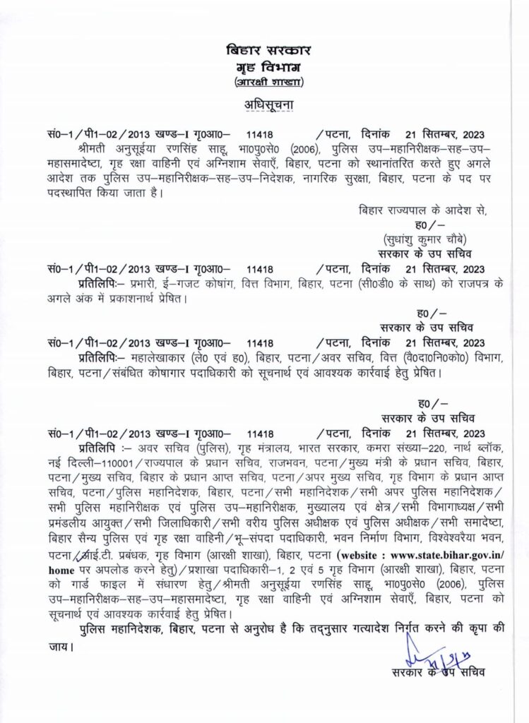 ब्रेकिंग न्यूज़:*—DG शोभा अहोतकर से विवाद के बाद हटाई गईं DIG अनुसुइया रणसिंह साहू, नीतीश सरकार ने किया तबादला, DIG अनुसुइया रण सिंह साहू ने DG शोभा अहोतकर के ऊपर लगाए थे भ्रष्टाचार के आरोप, 13 पन्नों का लेटर लिखकर उठाए थे गंभीर सवाल, इसके बाद DIG अनुसुइया रणसिंह साहू का हुआ तबादला….