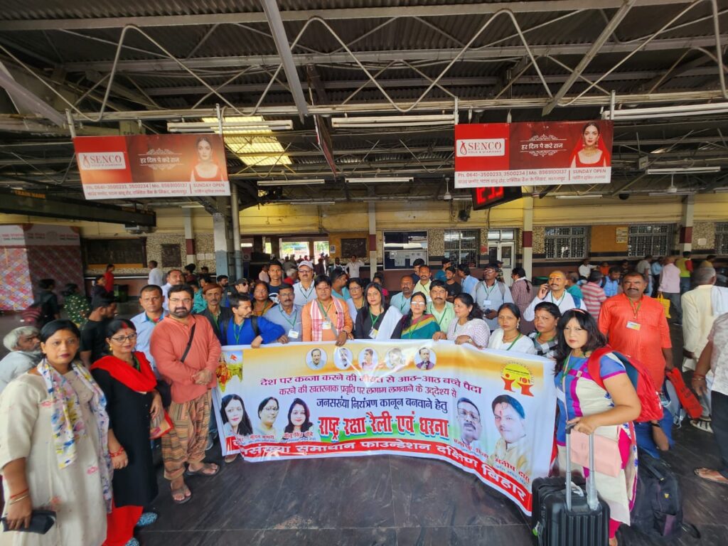 देश में जल्द जनसंख्या कानून बने इसके लिए जनसंख्या समाधान फाउंडेशन पूरे देश भर से करोड़ों हस्ताक्षर के साथ एवं हजारों कार्यकर्ताओं के साथ 29 और 30 अक्टूबर को दिल्ली में राष्ट्र रक्षा रैली एवं धरना का आयोजन कर रही है। इस कार्यक्रम को सफल बनाने के लिए आज दिनांक 27/10/ 2023 भागलपुर से जनसंख्या समाधान फाऊंडेशन के दर्जनों कार्यकर्ता प्रदेश सचिव मनीष दास एवं प्रदेश संयोजक महिला मोर्चा आनामिका ठाकुर जी के संयुक्त नेतृत्व में दर्जनों महिला एवं पुरुष कार्यकर्ता ट्रेन रूट से इस अभियान को शक्ति प्रदान करने दिल्ली कूच किया, देश में जनसंख्या नियंत्रण कानून का होना अति आवश्यक है ,देश पर जो जनसंख्या का अतिरिक्त भार हो गया है उसे हल्का करने के लिए जनसंख्या समाधान फाउंडेशन जल्द इस कानून को बनवाने में अपनी अहम भूमिका निभाएगी,दिल्ली कूच में प्रदेश सचिव महिला मोर्चा कुंदन कुमारी प्रदेश सचिव के संगठन मंत्री नीतू सिंह चौबे देश संगठन महामंत्री संजय कुमार सिन्हा,जिला अध्यक्ष चंदन कुमार कर्ण,प्रखंड अध्यक्षसंतोषकुमारसिंह, कंचन देवी ,चंदन पोद्दार, ए के पासवान, छाया सिंह,अमन कुमार सिंह, प्रियंका पांडे,कौशल पांडे, विद्या कुमारी,सत्यम कुमार,मनोज यादव,मनोरंजन कुमार सिंह, शेखपुरा से जिलाध्यक्ष रंजीत कुमार सिंह उर्फ वुद्धन भाई, नवादा जिलाध्यक्ष सुनील कुमार, खूशबू जी आदि ने दिल्ली के लिए कूच किया!