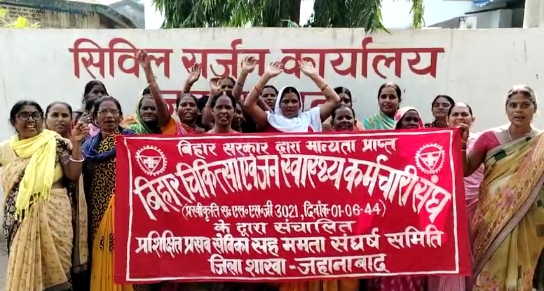 जहानाबाद में 10 सूत्री मांगों को लेकर ममता कर्मियों ने सिविल सर्जन कार्यालय का घेराव कर रोषपूर्ण प्रदर्शन किया। इस दौरान ममता कर्मियों ने नीतीश सरकार के खिलाफ जमकर नारेबाजी किया। ममता कर्मियों का मुख्य मांग कि हम लोगों को ड्रेस का पैसा, न्यूनतम 26हजार रुपया प्रतिमाह भुगतान, सेवानिवृत्ति होने के बाद 10 हजार पेंशन दिया जाय सहित 10 सूत्री मांग शामिल थे। ममता कर्मियों बताया कि हम लोगों का बकाया मानदेय का भुगतान लाख गुहार के बावजूद नहीं दिया जा रहा है। साथ ही हम लोगों के द्वारा बार-बार मांग किए जाने के बाद भी सरकारी कर्मचारी का दर्जा भी नहीं दिया जा रहा है। जिसे लेकर आज हम सब ममता कर्मी एकजुट होकर सिविल सर्जन कार्यालय के समक्ष प्रदर्शन कर रहे है और अपनी 10 सूत्री मांग के समर्थन में सिविल सर्जन को एक ज्ञापन भी सौंपा है। वही प्रर्दशन में बड़ी संख्या में ममता कर्मी शामिल थी।