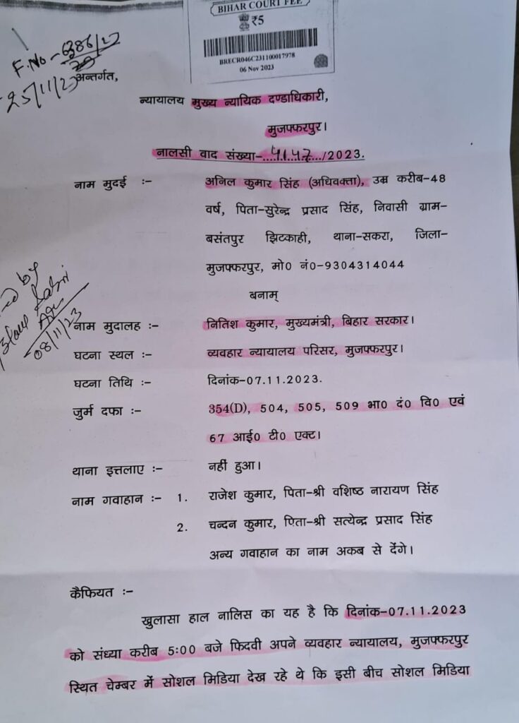 आपको बता दें कि मुजफ्फरपुर को कोर्ट में परिवादी के द्वारा आईपीसी की धारा 354(D) 504 505 509 और आईटी एक्ट 67 के तहत कराई गई है जिसको कोर्ट ने स्वीकार किया है और मामले में सुनवाई की तिथि 25 नवंबर 2023 को मुकर्रर किया गया।