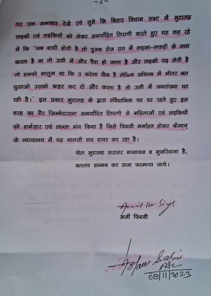 मामले में परिवादी अनिल कुमार सिंह ने बताया की सीएम नीतीश कुमार के द्वारा कल जिस प्रकार से बयान दिया था यह गैर जिम्मेदाराना है और एक संवैधानिक पद पर रहते हुए दिया है गया जो की महिलाओ और लड़कियों की भावनाओ को आहत करता है और एक जिम्मेदार पद पर रहते हुए इस प्रकार का बयान दिया गया यह महिलाओ को आहत करता है जिसे लेकर परिवाद दायर कराया गया है और इसको कोर्ट ने स्वीकार करते हुए मामले में 25 नवंबर को करेगी सुनवाई।