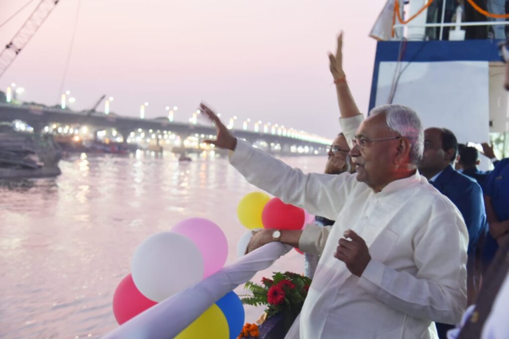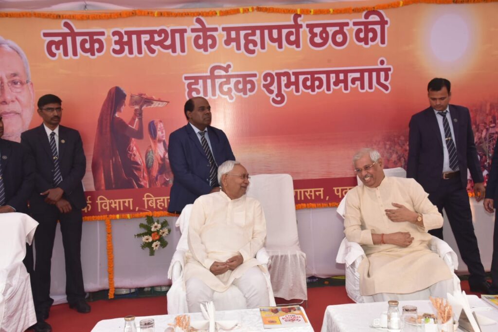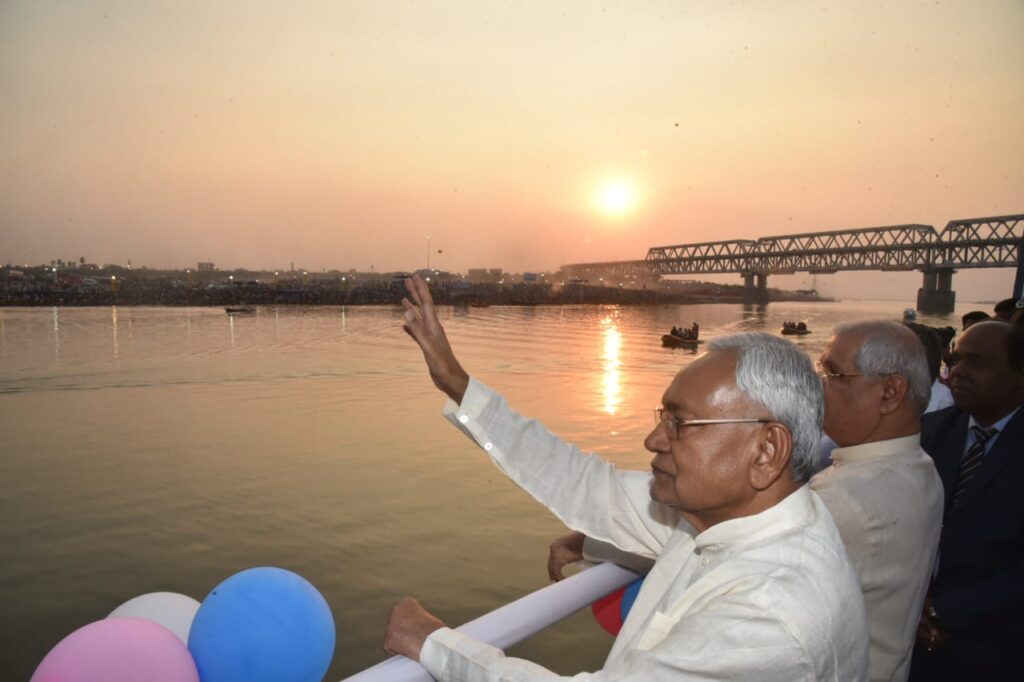 पटना, 19 नवम्बर 2023 :- राज्यपाल श्री राजेन्द्र विश्वनाथ आर्लेकर एवं मुख्यमंत्री श्री नीतीश कुमार ने दानापुर के नासरीगंज घाट से गायघाट तक स्टीमर द्वारा गंगा नदी के विभिन्न छठ घाटों का भ्रमण किया और छठव्रतियों एवं राज्यवासियों को छठ की शुभकामनायें दीं। लाखों की संख्या में श्रद्धालुओं ने गंगा नदी के विभिन्न घाटों पर अस्ताचलगामी भगवान सूर्य को अर्घ्य अर्पित किया। घाटों पर उपस्थित श्रद्धालुओं ने मुख्यमंत्री श्री नीतीश कुमार का अभिवादन हाथ उठाकर किया। मुख्यमंत्री ने भी सभी लोगों का अभिवादन हाथ उठाकर स्वीकार किया।