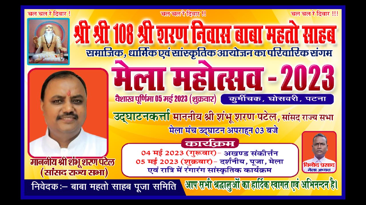 पटना- शुक्रवार को धानुक समुदाय के कुल देवता संत सिरोमणी श्री श्री १०८ श्री शरण निवास बाबा महतो साहब जी महोत्सव कुर्मीचक में! May 4, 2023 No Comments